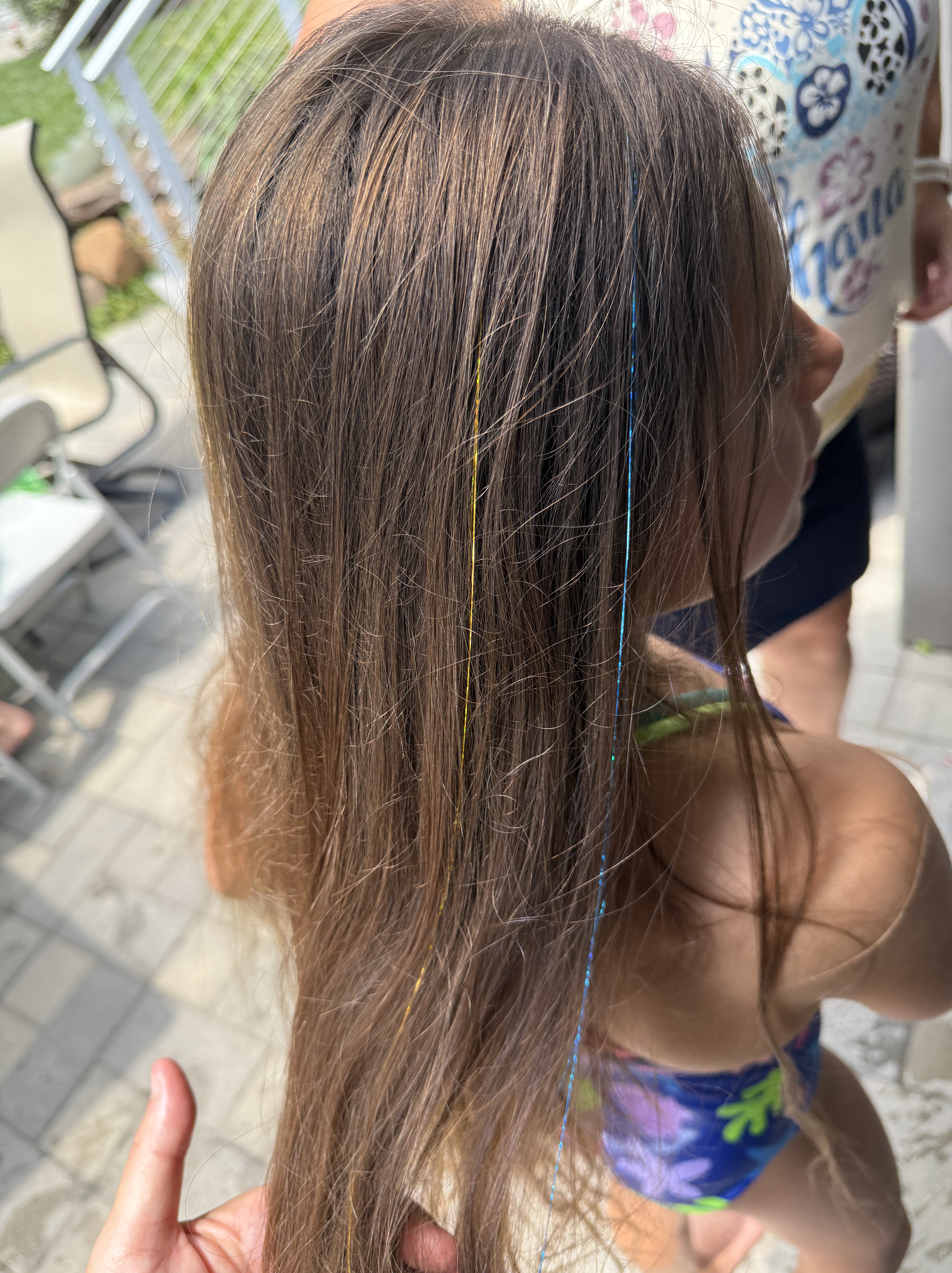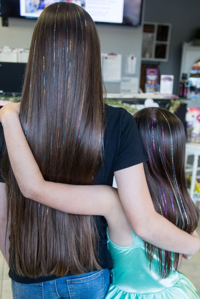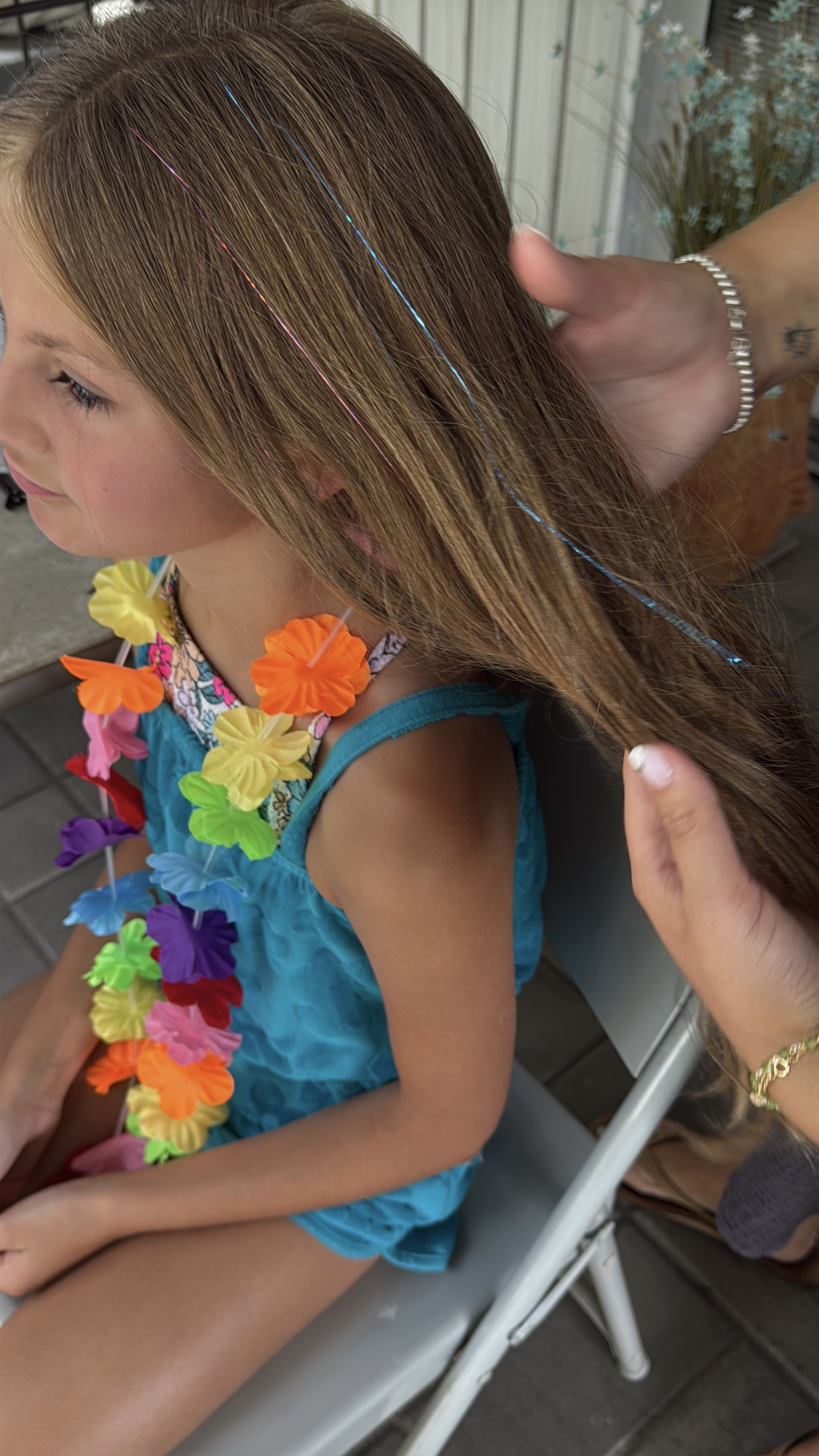Fairy hair or hair tinsel are strands of tinsel that can be attached to the hair through a special fairy hair knot with our a tinsel tool. It adds a sparkle of highlights to your hair